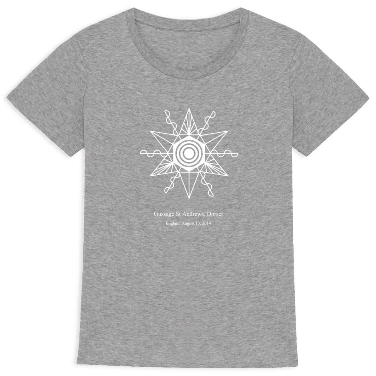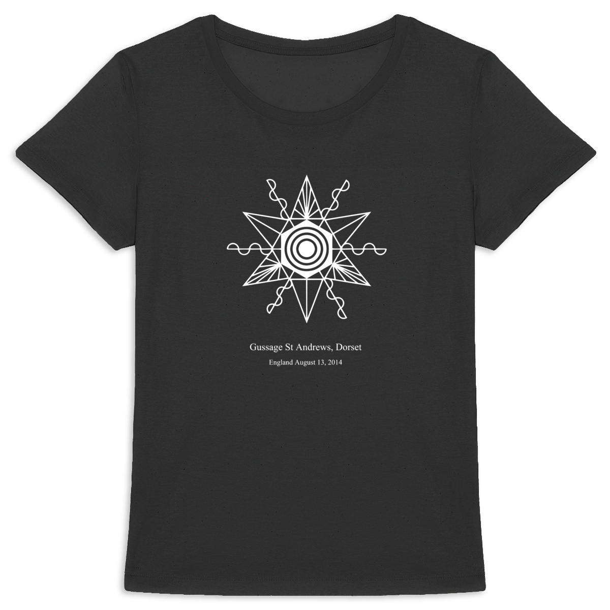 Un t-shirt en coton bio imprimé en blanc du crop circle apparu le 13 août 2014 à Gussage St Andrews (Dorset, UK). Un motif étoilé à spirales, véritable vortex d’énergie sacrée.
